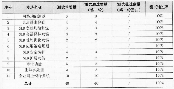 功能性方面:測試范圍包括網絡功能測試、SLB健康檢查、SLB負載均衡算法、SLB會話保持功能、SLB安全防護、SLB擴展測試等11個模塊,共計執行40條用例,均通過測試。