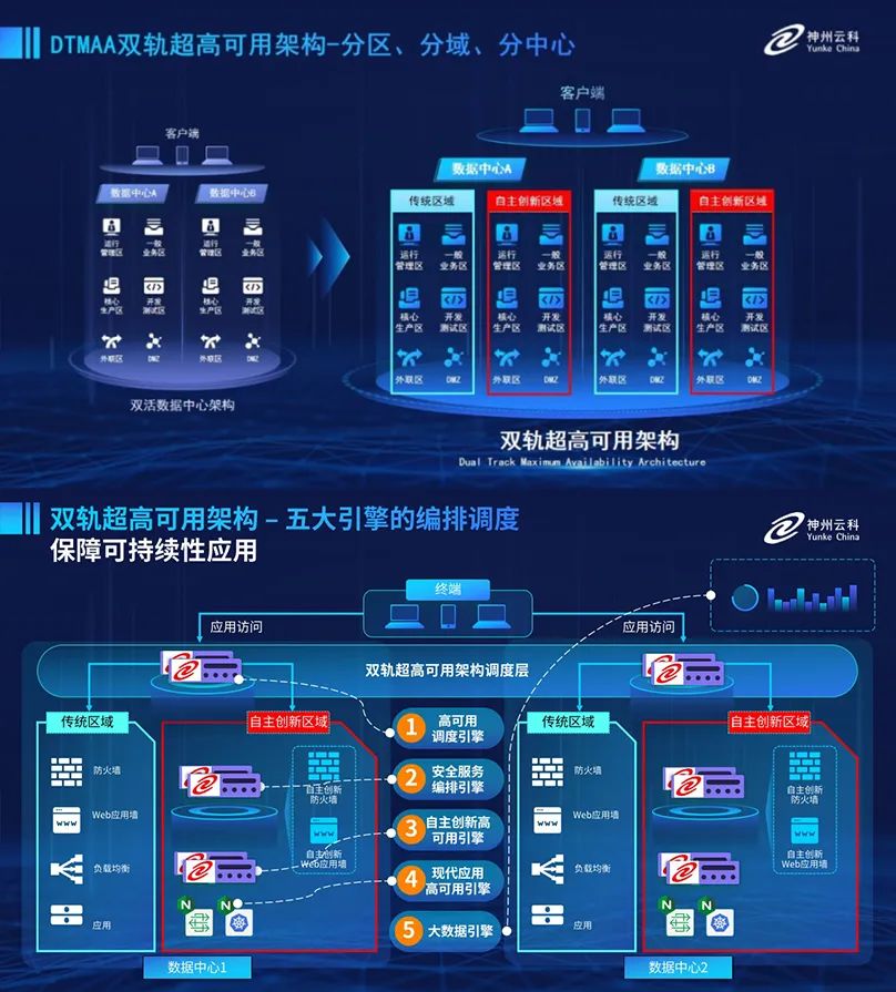 為助力銀行業務高質量發展,更好地應對數字經濟時代對可持續性的高要求,實現“信創”與“數字化”齊頭并進,k8凱發創新性的推出了雙軌超高可用架構。該架構在雙活數據中心的分區調度基礎上,增加信創域和非信創域的分域調度,實行信創域與傳統域應用全量部署,使雙中心運營變為雙中心四區域并行運行,互為多活,將“0到1”的單軌建設道路變為分區分域協同的多活雙軌超高可用架構。幫助客戶在新架構下,保障“信創”的同時解決性能瓶頸,提升穩定性,保證應用可持續性,最終實現信創區域和非信創區域的平滑過渡,完成國產化替代目標。