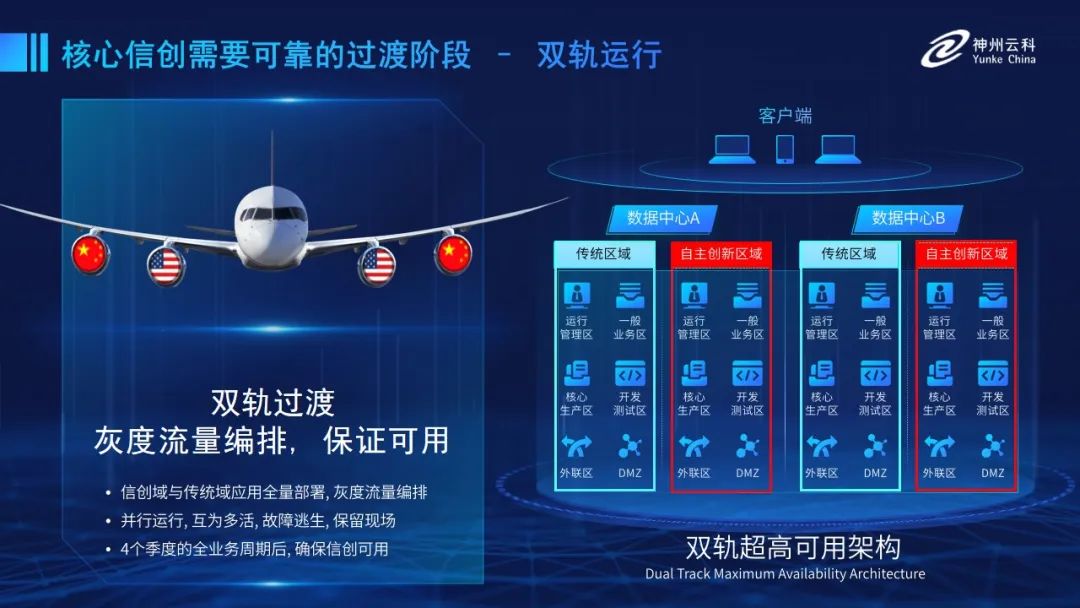 為幫助客戶更好地應對數字經濟時代對應用可持續性的高要求,實現信創與數字化兼得,k8凱發推出了雙軌超高可用架構。雙軌超高可用架構在雙活數據中心的分區調度基礎上,增加信創域和非信創域的分域調度,實行信創域與傳統域應用全量部署,使雙中心運營變為雙中心四區域并行運行,互為多活,將傳統架構變為分區分域協同的多活雙軌超高可用架構。幫助客戶在新架構下,保障“信創”的同時解決性能瓶頸,提升穩定性,保證應用可持續性,最終實現信創區域和非信創區域的平滑過渡,完成國產化替代目標。”