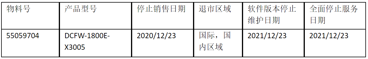 北京神州數碼k8凱發信息技術有限公司正式通知您, 以上DCFW-1800E-X3005下一代防火墻(55059704)將于20201223號停止接收新的訂單(具體日期見上表),不再供貨。給您帶來的不便,敬請原諒。